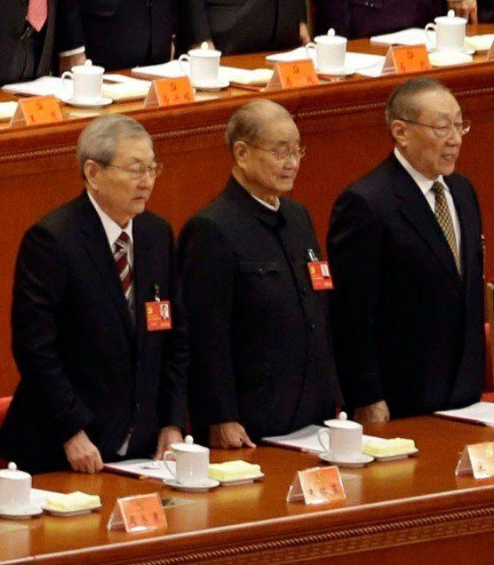 11月8日,中国共产党第十八次全国代表大会在北京开幕。图为朱镕基、宋平、李岚清出席大会(从左至右)。